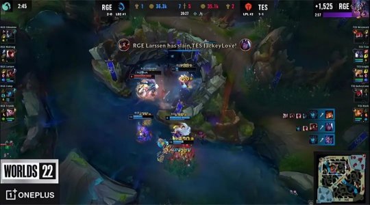 大龙出生前TES中辅在上路抓到了洛,不过洛反手开大拖到队友赶到,TES中野反而双双阵亡。RGE直接开打刚刚“上班”的大龙,TES剩余三人没有抢到大龙陆续倒地,RGE打出一波0换5团灭TES大获全胜,利用大龙buff的推进滚起了4千的经济雪球。TES的外塔仅剩上、中路二塔,局面相当被动。纳尔在上路单带时又被抓死了两次,TES无力争夺大龙,只能推掉RGE中路水晶,但经济仍然落后8千。32分钟RGE在中路打出1换4一波结束比赛,稳扎稳打豪取三连胜!
