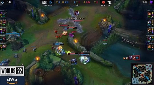 开局RGE众人集结在峡谷先锋河道,这被沙皇发现之后TES下路顺利地进入RGE下半野区做了视野,捕捉到盲僧红开的信息,巨魔则从上往下刷。3分钟巨魔想要gank下路时被RGE小龙河道的视野发现,遭到盲僧和RGE下路组的追击,随后双方中单支援赶到,卡莉丝塔被逼出闪现并和队友脱节,韦鲁斯拿到一血。
