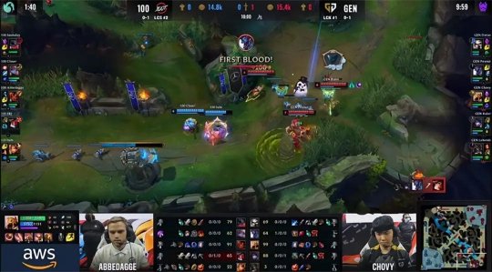 开局GEN中、下路都手握线权,巨魔3级抓下时柱子没有卡好,只逼出女枪的净化。Ssumday的剑魔在上路稳稳地压制了Doran的青钢影,GEN只能让上路抗压,转而控下风龙,100T则利用上路的对线优势拿到峡谷先锋。