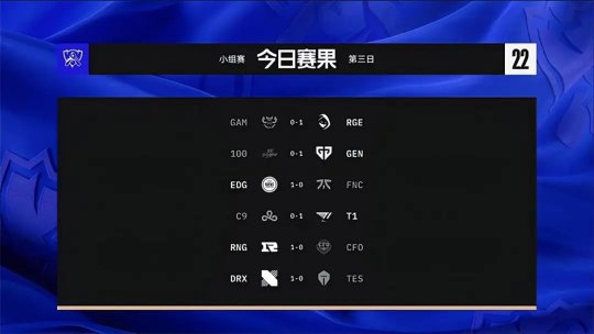 2022英雄联盟全球总决赛小组赛第三天的比赛已经落下帷幕,四连败的LCK赛区在今天状态终于开始回暖,DRX更是正面掀翻了LPL二号种子TES,用全胜战绩结束今天的比赛。EDG通过强势下路掀翻FNC保留了竞争A组第一的机会,RNG也没有悬念地大比分战胜CFO坐稳D组头名。反倒是人们相对看好的TES战队全程被DRX压制惨败。以下是小组赛第三日的全部赛果。