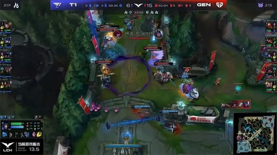 GEN中野合力包上稳稳拿下了塞恩一血。随后双方中野2v2对抗,提前到6的冰女一套技能让小法失去作战能力,猴子在侧翼被猪妹黏住击杀。GEN的中野节奏再一次领先,不久以后下路四包二强杀了金克丝,小法急忙赶到救下塔姆,赛恩索性牺牲兵线直接支援下路,终于掩护小法收掉霞的人头,随后残血的猪妹在野区打魔沼蛙被金克丝大招盲视野击杀。T1将双人组换线到上路击杀纳尔,金克丝再拿一个人头,总算暂时稳住了局势。比赛节奏逐渐放慢下来,GEN利用现有的优势展开运营稳健控制资源,慢慢地扩大领先。而T1也在努力给双C争取发育时间,双方都等待着中期关键的团战。