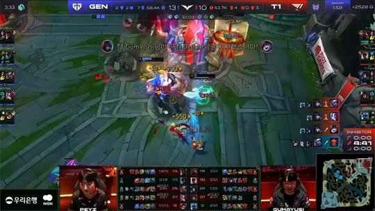 GEN士气大振抱团推进中路,又一次先手斩杀了阿狸,随后从中路长驱直入推上高地。T1队员复活以后GEN佯装撤退在中路形成对野区T1大部队的反包围,但是T1的阵型紧密没有漏出破绽,反而趁机反打击杀GEN三人,双方激情混战一番以后各自拉开。回城休整以后GEN继续贯彻保护双射手的策略,T1缺乏稳定点控很难对GEN后排制造威胁,金克丝继续疯狂输出接管团战。31分钟左右GEN拿下大龙以后回身开团追击,盲僧赛恩试图扭转局面结果先后阵亡,GEN士气如虹继续保护双杀手稳扎稳打,从中路强拆基地想要一波结束比赛,但厄斐琉斯在绝境之中舍命输出斩杀了GEN双C,硬生生守住基地保住一线希望。