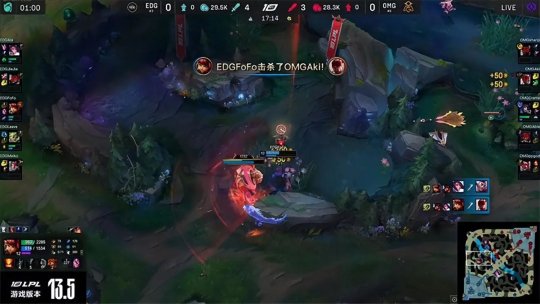 盲僧在上路越塔赛恩被换掉人头,与此同时下路厄斐琉斯被蜘蛛越塔带走,OMG急于为下路挽回局面,厄斐琉斯锤石差一丝血线杀泽丽却被璐璐反杀。随后阿卡丽和盲僧也不顾一切支援下路强行打成3换2被杰斯拿到了两个人头。眼看着前期节奏即将崩盘,OMG在先锋团站里主动出击,阿卡丽盲僧联手进场瞬间斩杀泽丽璐璐,同时奎桑提上路单杀赛恩,OMG打出0换3收下先锋一举追回之前的落后,EDG调整战术重回下半区拿到第二条小龙。泽丽璐璐在下路草丛眼上蹲被盲僧R闪秒杀连续第三次阵亡,奎桑提则通过之前的优势开始越塔断兵反野,收割了EDG上半区的资源。