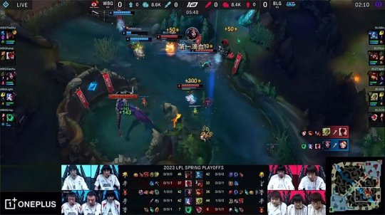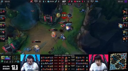 开局WBG抱团入侵BLG下半野区,泰坦闪现Q逼出厄斐琉斯的闪现,双方打野互换了红buff野区。安妮推完第一波兵线回城后传送下路一塔,摸进草丛先手Q留下了锤石,韦鲁斯交双招帮安妮拿到一血。