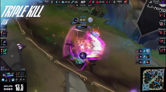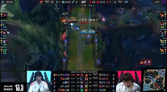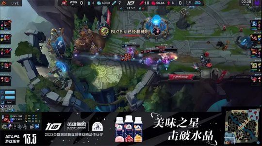 虽然BLG三路都没线权,但是前期的节奏顺风顺水:大树打小龙河道迅捷蟹时被盲僧追击,在双方中野缠斗的过程中,BLG下路组打出金克丝的双招,导致WBG下路只有锤石能支援中野,BLG打出0换2击杀了WBG中辅,同时纳尔在上路打出凯南的闪现,WBG的线权优势荡然无存。BLG稳稳地控下水龙加峡谷先锋,撞掉WBG中路一塔的镀层,随后BLG众人抢占了小龙坑的位置,先集火打残了杰斯,盲僧一脚送走大树回身惩下风龙。16分钟WBG众人追死了换线到下路的塞拉斯,BLG三打四完全不虚,Elk的泽丽灵活拉扯斩获三杀,纳尔还在上路越塔单杀了凯南,BLG打出1换5团灭WBG大获全胜!