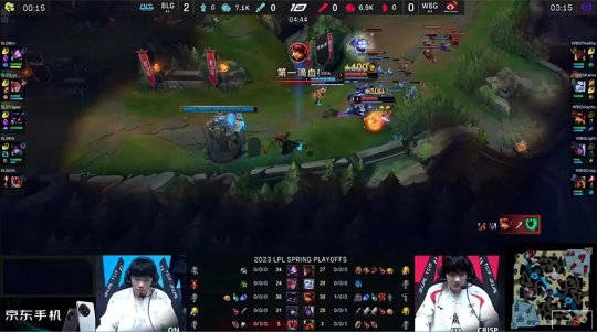 双方辅助都选出了各自的招牌钩子英雄,同时Crisp和ON也都直面各自去年的老东家,因此前期下路火药味儿十足,机器人连续两Q命中,交引燃换了锤石的双招。5分钟盲僧偷小龙时被发现,并演变为一波中野及下路组八人大乱斗,机器人和锤石互相空Q“以示敬意”,妖姬拿到机器人的一血,和猴子用各自的假身拖到奎桑提传送落地参战,WBG得以打出2换2,妖姬收获双杀发育起飞~