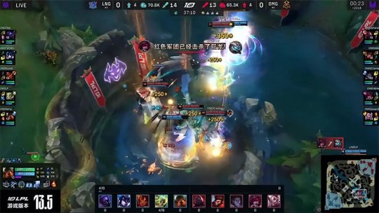 资源和视野全面占优的OMG为了提速选择抱团偷打大龙,LNG发现异常以后迅速赶到野区准备接战,阿卡丽从后方突然杀出目标直指小法,不过LNG反应迅速全员后撤,墨菲特不顾一切强行先手阿卡丽但队友被凯南天雷分割,OMG打出1换2以后收下大龙Buff,小法启封秘籍换出惩戒可惜没有技能进入龙坑。OMG全身而退继续稳扎稳打扩大优势,LNG在下路二塔先手失败牺牲猴子,OMG趁机收割掉中下外塔并且破掉中路高地,再收下风龙魂,将经济优势扩大到9千块左右。