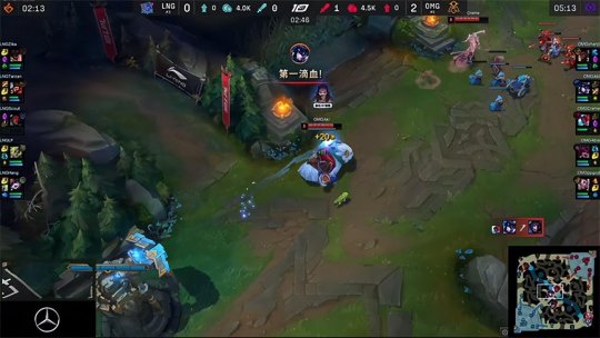 猪妹在中路Gank成功击杀了塞拉斯拿到一血,而猴子也敏锐地在野区找到机会单杀了岩雀。霞在下路想要尝试单杀泽丽结果被LNG双人组联手反杀。几分钟以后双方在小龙处爆发团战,LNG凭借精妙的配合打出一波1换4重创OMG,成功取得了前中期优势并且开始滚起雪球。OMG队员复活以后痛定思痛来到上半区与LNG争夺二先锋,泰坦在中路了先手勾到洛但洛灵活地摆脱了集火,OMG趁机发动反击斩杀了急于收割的LNG双C,推进中路打出一波1换4基本追回了之前落后的经济。