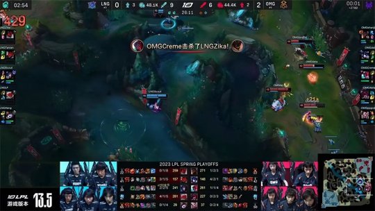 2023 LPL春季赛季后赛第三轮6进4第二场的比赛,OMG战队即将与LNG战队展开正面对决,胜者将晋级四强并且获得双败赛制复活甲。常规赛仅获得第六名的OMG在赛前是不被所有人看好的一方,但他们在这个版本如鱼得水,凭借全员齐心协力的团战发挥惊艳全场,最终出人意料地以3-1的比分击败了LNG战队,时隔2175天重返LPL四强!
