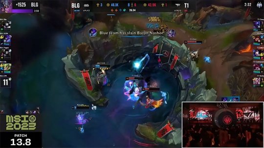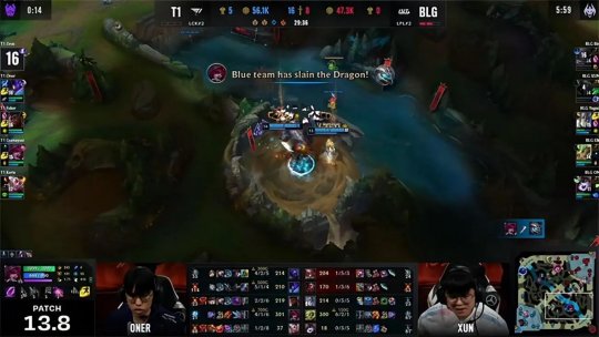 39分钟的水龙魂决战BLG完全站住河道位置想要逼退T1以后拿下龙魂,但猴子再次出其不意摸进龙坑抢走了水龙魂,BLG立刻进退两难,眼见大龙刷新只能尝试逼团,T1的阵型非常紧密不给BLG任何的机会,找到机会秒掉佛耶戈以后劝退BLG拿到了双龙会。T1水龙魂在手带给BLG较大的压力,他们自信地在中路二塔选择了越塔强开泽丽,但是泽丽净化在手加上璐璐的保护非常轻松地摆脱了追击,武器与佛耶戈立刻带领队伍展开反攻,T1苦心维持了20多分钟的防线在最后一波团战土崩瓦解,BLG抓住机会中路长驱直入,将冰女与复活的猴子和洛悉数击杀以后强拆基地结束了比赛,恭喜BLG取得1-0领先!