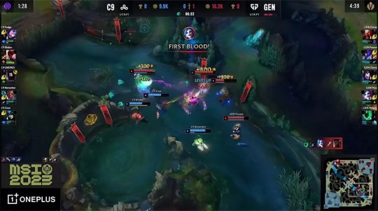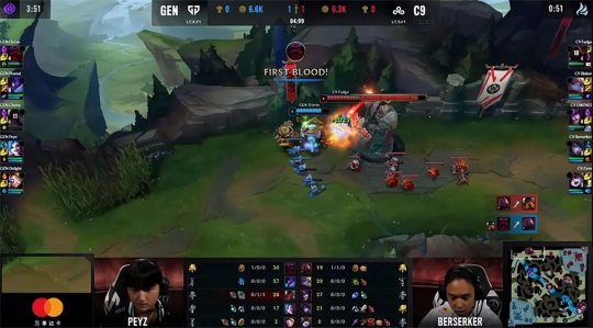开局双方下路火药味儿十足,C9下路组抢到2级,打出GEN两人的双闪现。Chovy的泰坦清完兵线选择帮队友建立优势,游走到上路帮奥恩拿到赛恩的一血,不过赛恩也硬换了泰坦。