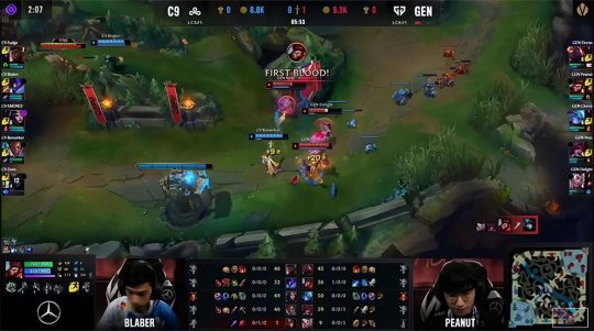 Peanut的螳螂这一把本想变奏,3级抓上时被凯南插在三角草丛的饰品眼发现,只能回野区发育。前期C9中、下两路难得手握线权,盲僧得以控下水龙,不过GEN赶来尝试留人,阿狸先手的E技能魅惑到奎桑提,金克丝拿到一血,阿狸也击杀了娜美,GEN打出0换2完全不亏。