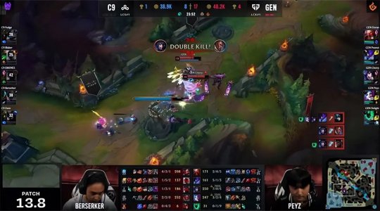 前期GEN野辅联动的攻势相当凌厉:螳螂gank下路得手,机器人先手Q钩到璐璐,螳螂补伤害将其带走,随后GEN野辅频频光顾上路,赛恩连续阵亡三次,虽然自身的发育没有受到太大影响,但C9上路的劣势导致波比很难控资源,GEN得以控下风龙加峡谷先锋,螳螂把先锋放在下路养金克丝。15分钟双方在下路河道互换了一波技能,GEN劝退C9之后控下海克斯小龙,掩护金克丝推掉C9下路一血塔。虽然厄斐琉斯的发育仍然领先于金克丝,但GEN上野的优势更大,波比去上路河道排眼时直接“白给”,GEN得以稳稳地拿到第二只先锋。