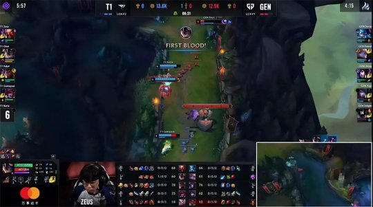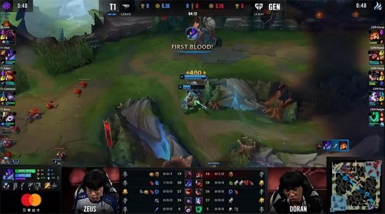 开局3分钟双方中野及下路组为了小龙河道的迅捷蟹大打出手,机器人先手Q钩回塔姆,龙王阻隔了T1中野,GEN帮助金克丝拿到机器人的一血,塔姆闪现W逼出厄斐琉斯的闪现。