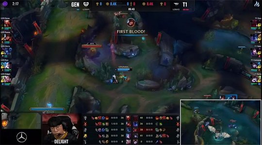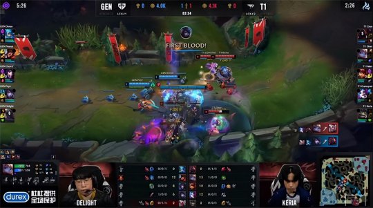 开局阿狸在中路激进压制,用蓝量换了丽桑卓的血量。丽桑卓摇来猴子gank,阿狸压线过深选择反向逃进GEN的上半野区,酒桶交闪现绕后包夹,阿狸见逃跑无望放弃交闪现,被猴子拿到一血。
