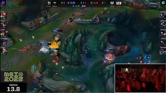 中期T1进入自己最为擅长的分带拉扯领域,GEN进入大龙河道做视野,迫使T1赶来回防大龙。Oner的兰博完美大招烤到GEN全员,也起到了绝佳的劝退效果。GEN退到中路没有回城补状态,而是冒进地选择先手强开霞,Gumayusi的霞光速大招规避了GEN的控制,倒钩伤害拉满秒掉波比。Faker的奎桑提开大带走了厄斐琉斯,并且成功将其终结!T1反打出一波突如其来的0换4,平推中路一波结束比赛,有惊无险3-2击败GEN晋级胜者组决赛!