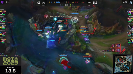C9忍无可忍终于在中路找到一波机会先手秒掉了站位过于激进的辛德拉,虽然BLG拿到了小龙但C9众人已经扑向大龙坑。BLG四人徘徊在龙坑外侧没有进场角度,只能寄希望于蔚。蔚也不负众望地极限Q进龙坑抢到了大龙,并且利用加里奥做位移再闪现摆脱了C9的集火。这样一来BLG仅仅阵亡一个辛德拉就拿到了大小龙两个资源。BLG队员回城休整以后准备同时推进中下,塞恩在下路开车想要先手落单的凯南,蔚为了救援队友牺牲了自己。卢锡安尝试从侧翼极限偷人可惜千珏和霞都只差一点血量,BLG只能结束推进,用一个回马枪杀掉清线的赛恩以后再回城补给。