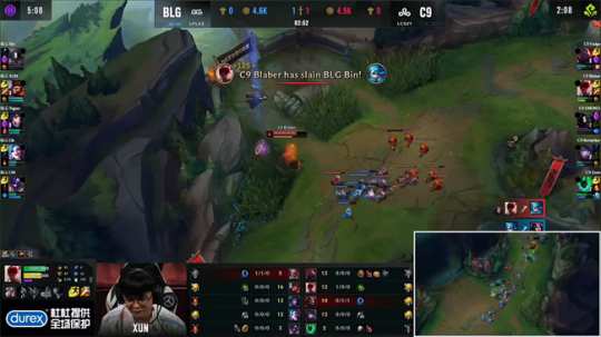 BLG展开卢娜换线以后的第一波攻势,一套爆发直接秒杀了洛,蔚在河道发现了塞拉斯配合上野将其斩杀,C9则在侧面集火带走卢锡安。BLG穷追不舍想要扩大战果可是C9迅速退到了F6,就在双方以为团战就此作罢之际纳尔勇猛地闪现过墙斩杀了霞并且大招留下梦魇,BLG队员跟进打出一波1换4。C9逐渐陷入了被动,中野辅大招开团的人选必须慎之又慎,先后针对娜美和卢锡安发动进攻可是都效果不佳。纳尔在中路团战里完美的怒气控制TP落地直接变大拍到两人帮助BLG再次0换3赢下团战。