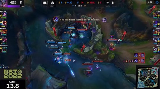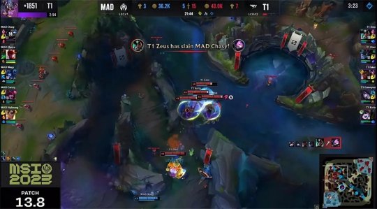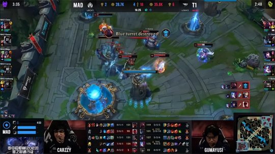 MAD复活之后掩护第二只峡谷先锋推掉T1中路二塔,回身选择直接开大龙,Oner的螳螂E进龙坑拼惩戒抢到大龙!T1打出3换3完全不亏,只付出上路二塔的代价就通关了MAD中路,经济只落后2千,进攻压力也来到了MAD身上。29分钟MAD在大龙河道集火秒掉落单的奎桑提,继续追击T1剩余四人,Keria的璐璐坩埚秒解控制,令厄斐琉斯顺利拉开身位并且疯狂输出,璐璐再闪现过墙“变羊”干扰霞的输出,帮助T1四打五打出2换5团灭MAD,收下第二条男爵大获全胜,实现了经济反超!最终T1在小龙河道依靠Faker泰坦的先手开团融化了霞,摧枯拉朽平推中路打出1换3一波结束比赛,逆风翻盘1-0先下一城!