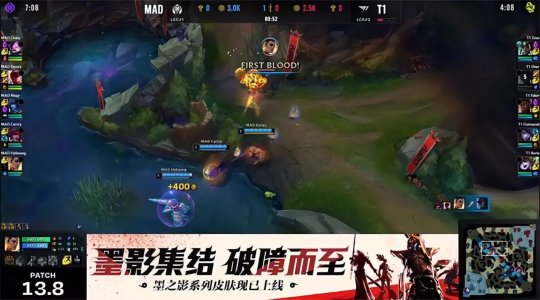 前两把被MAD套路的T1在这局比赛找回了场子:赛恩1级出现在下路,T1上野加下路组进行了一波越塔四包二,虽然盲僧拿到了赛恩的一血,但赛恩的被动战力十足,T1还是打出了1换2,赛恩和金克丝各拿到一个人头完全不亏。