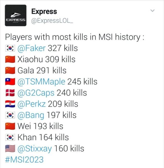 今日外媒Express给出MSI总击杀数排行统计,Faker以327杀成功夺魁(纪录还将在今年继续刷新),Xiaohu与其仅相差18个人头.
