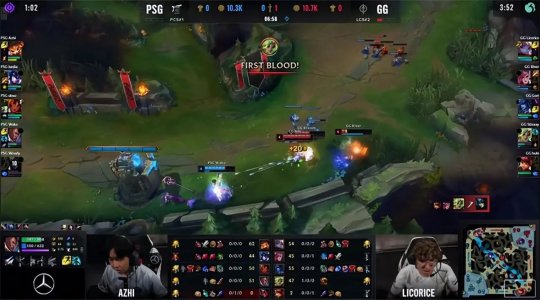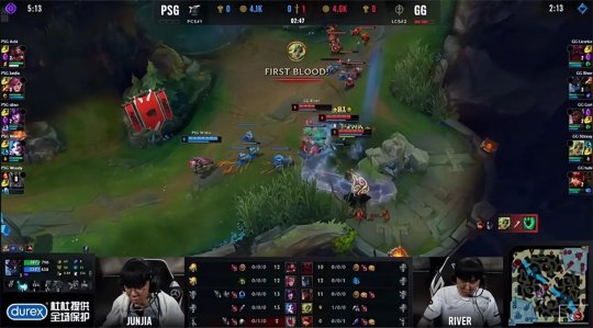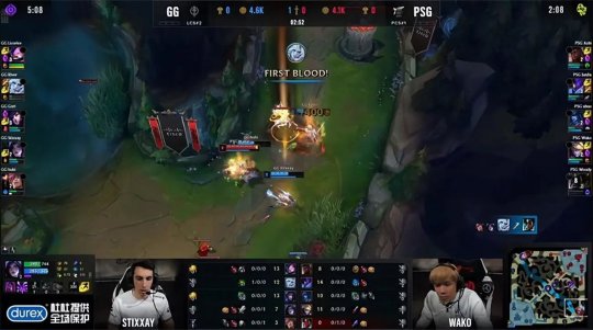 手握三个赛点的GG在这一把选出了四保一阵容,大树很清楚前期一定要为泽丽的发育保驾护航,开局直接反了PSG的红buff野区,紧接着绕后gank下路,Junjia的蔚完全没有预料到大树的刷野路线,只能目送泽丽拿到锤石的一血。