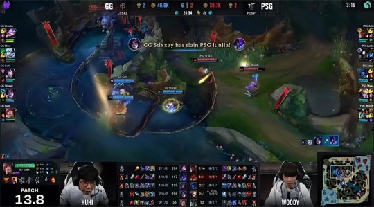 前期下路自然是双方打野的博弈重心,虽然蔚4级抓下时带走了安妮,但随后GG中野辅在PSG下半野区打出1换2,奎桑提收获双杀,GG顺利地控下海克斯小龙。经此一役GG在下半张地图确立了优势,辛德拉在中路根本推不过奎桑提。蔚只能利用上路的线权优势拿到峡谷先锋,撞掉GG下路一塔的镀层进行止损。15分钟泽丽单吃了PSG下路一血塔,作为交换PSG抱团拿到第二只先锋,大树趁机控下炼金小龙。PSG选择放先锋养纳尔,不过纳尔直接点掉上路一塔,PSG的先锋没有撞到GG上二塔直接“白给”,大龙出生前GG的经济仅落后2千问题不大。