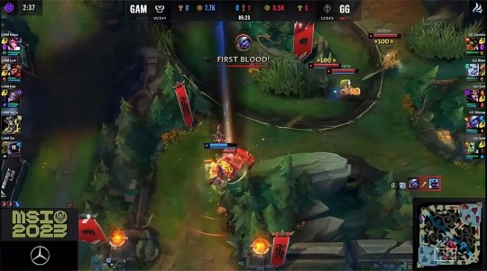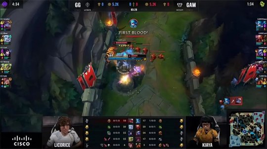 前期双方打野的博弈仍然是重中之重,佛耶戈刷到3级入侵GAM上半野区,被刚刚打完蓝buff的猴子逼出闪现,随后佛耶戈击杀了小龙河道迅捷蟹,利用等级优势劝退了猴子。5分钟GG野辅入侵GAM下半野区,阿木木先手Q留下布隆,帮小炮拿到一血。