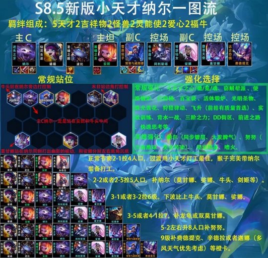 天才系列上手简单,S8开始就是主流羁绊,天才佐伊从开服强势到结束,S8.5佐伊替换为纳尔。不知道大家注意到更新没有,纳尔开始无人问津,5天才的增伤和减免伤害是有加强的。