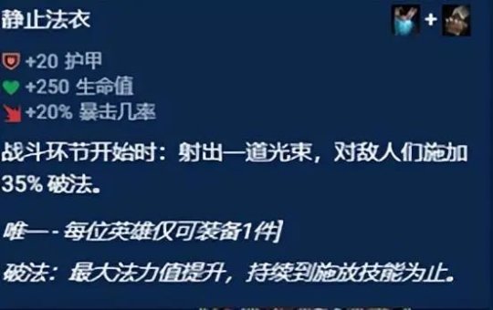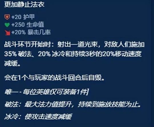下面以常规装备“静止法衣”和小天才装备“更加静止法衣”为例对比说明,小天才的“更加静止法衣”多了新效果:“20% 冰冷和持续3秒的20%移动速度减缓”,其他小天才装备也均有拔高。感兴趣的小伙伴可以前往官网查阅小天才装备属性。