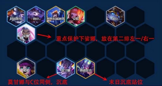 3-5(大连胜)或者4-1(正常拉人口,经济太差就4-2拉)拉7人口,补一个龙龟打控制(龙龟单卡V13.8版本加强)或者上双莫甘娜。血少就在7级扳命,d体系内牌3星。血多就在7级卡着50利息慢d3星,三星优先级:纳尔>安妮>莫甘娜=琴女。注意留一张波比,我们终极目标是上8找到努努上波比开出5天才。如下图: