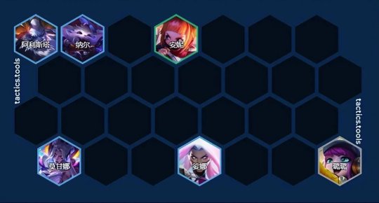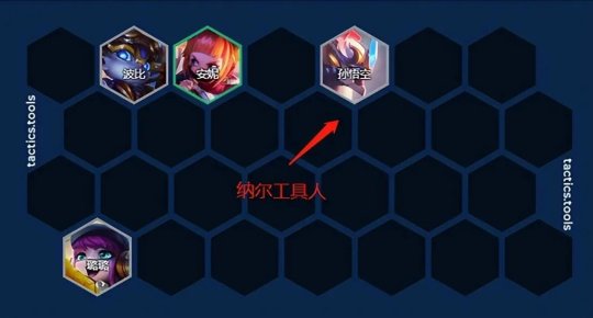 正常节奏2-1拉4人口,过渡用小天才打工最佳,猴子完美带纳尔装备打工。或者没有小天才可以先用双前排+双后排的过渡(通用过渡):2护卫+2决斗,2护卫+2迅捷等。如下图: