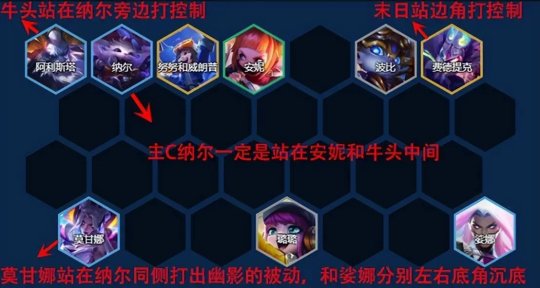 如上图,主C纳尔站在牛头和安妮中间保护起来,纳尔一般对位对方C位,牛头站纳尔旁边帮忙点控,莫甘娜站在纳尔同侧打出幽影的被动,和娑娜分别左右底角沉底。末日站第一排边角(站对方C位前面)跳大控场。