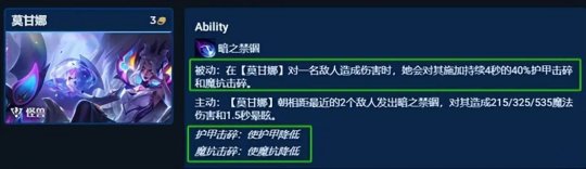 答:因为莫甘娜被动对一名敌人造成伤害时,她会对其施加持续4秒的40%护甲击碎和魔抗击碎效果,类似于S7赛季的“幽影”机制,且莫甘娜本身带控,是十分强力的单卡。莫甘娜站在纳尔同侧打出幽影的被动,快速帮忙纳尔完成清场。