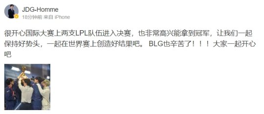 微博原文:很开心国际大赛上两支LPL队伍进入决赛,也非常高兴能拿到冠军,让我们一起保持好势头,一起在世界赛上创造好结果吧。 BLG也辛苦了!!!大家一起开心吧