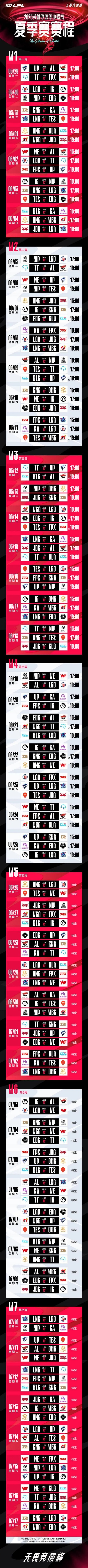 今年LPL夏季赛常规赛于5月29日盛大开幕,7月17日结束。第一周的周一到周四为每天两场BO3,周五到周日则是每天三场BO3。第二周到第四周强度升级:每周只有周一和周二是两场BO3,从周三开始到周日每天都是三场BO3。第五周到第七周强度直接“封顶”——只有周一是两场BO3,从周二到周日每天均为三场BO3。7月17日(周一)为夏季赛常规赛收官日,两场比赛分别是RNG vs LGD和WBG vs EDG。