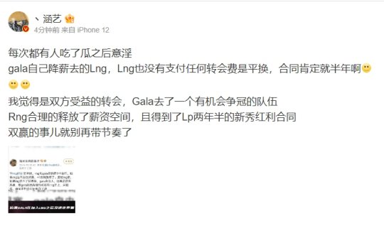 对此,最早爆料出GALA转会的前LPL教练——涵艺更新微博回应:双赢的事儿就别再带节奏了!GALA自己降薪去的LNG!LNG没有支付转会费是平换,合同肯定就半年。