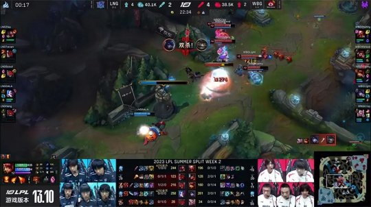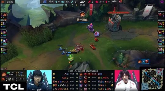 开局WBG下路组的双poke压制力十足,大树反LNG的蓝buff时被猴子发现只得作罢,不料Scout的安妮推完兵线游走到下路,和猴子两翼包夹抓死了大树,安妮拿到一血赏金加大树的红buff,弥补了自己的补刀劣势。
