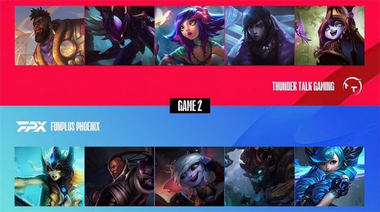 FPX围绕发育成型的泽丽展开攻势,逐渐将优势扩大,更是连续在团战里击败了TT拿到三条小龙。26分钟左右落单的奎桑提在河道单挑泽丽悠米结果自己反被击杀,TT尝试反开泽丽可是被FPX彻底冲垮了阵型,泽丽势不可挡砍下四杀带领FPX击溃TT以后拿到大龙Buff。回城稍作休整以后FPX准备在中路推进,TT再次尝试集火泽丽可是只打出了泽丽的复活甲,奇亚娜和大树联手摧毁了TT的防线三杀粉碎了TT的最后希望,FPX高歌猛进一波结束比赛,取得1-0领先!