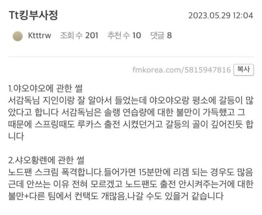 我和seok(TT的赛训总监,韩国人)的熟人很了解,听说seok和yaoyao平时有很多矛盾。 seok对yaoyao的rank练习量非常不满,因此当时派Lucas参赛,两人的矛盾似乎加深了。