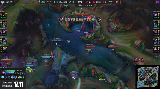 第二条大龙刷新,WBG快速rush掉,两队来到中路开团,两队上路一起阵亡,WBG四人追逐BLG四人,BLG的核心泽丽被击杀,WBG这波团战大获全胜团灭BLG赢下第一局比赛。