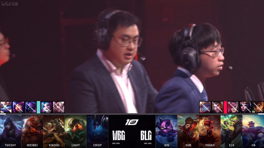 BLG在一血过后,他们野区资源控制非常的好,控下了两条小龙,蔚与下路两人一起在下路将WBG的中野击杀。随后上野的配合BLG在上路连续两次将WBG的奎桑提击杀。