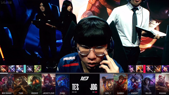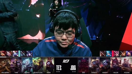 比赛开局8分钟,JDG的猴子下路Gank拿下一血,TES蔚虽然被击杀,但霞伤害打满将JDG猴子和洛击杀。随后上路TES的鳄鱼报了上一局的单杀之仇,将JDG上路单杀。