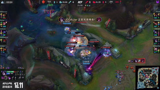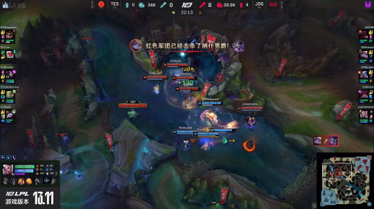 JDG看似开局有些小落后,但是他们野区资源和对线补刀并没有落后,反而还领先TES一些,在15分钟上路河道团上,JDG还打出1换2,成功将击杀比分扳平。18分钟的小龙团,JDG拿下小龙之后,猴子直接冲进TES人群,猴子大闹天宫大起TES四个人。