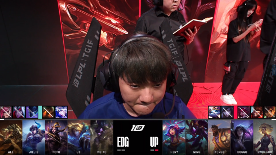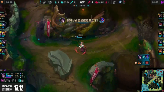 比赛前期两队打野互相针对对方的中上,EDG帮助沙皇拿到安妮的一血,UP的卡兹克则是在上路帮助奎桑提击杀鳄鱼。而下路是EDG的主动权,EDG在下路投入了两个TP帮助下路将UP两人击杀。