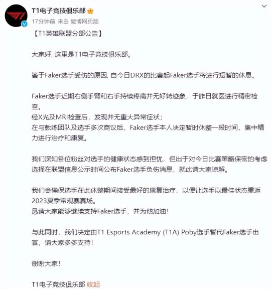 此前T1就发公告,Faker因为手伤暂停七月的直播。也有海外博主爆料,Faker选手在上周与NS赛后拍摄过程中就说过自己手臂太痛。