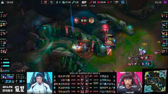 比赛26分钟两队在拉扯大龙,这波团战LNG大获全胜直接团灭AL,但是未能抢到大龙,只拿到了小龙。AL复活过后,两队都在推线,AL推掉LNG中路外塔,LNG则是在上路破掉AL的高地。在30分钟中路团战,LNG的双C在这波团战输出拉满团灭AL赢下第一局比赛。