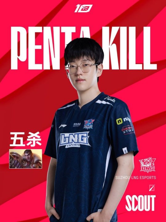 在刚刚结束的LNG vs LGD第一局的比赛中,LNG.Scout选手使用杰斯拿到五杀。