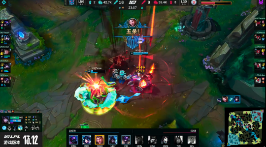 比赛13分钟LNG中野来到下路,将LGD下路两个人击杀,LGD的猴子支援速度太晚,赶来的时候又被LGN击杀。这波打完两队都来到先锋处,LGD虽然拿下先锋,却被LNG留下四个人。