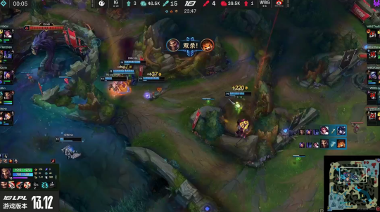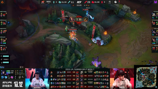 比赛来到24分钟小龙刷新,WBG选择直接放掉给IG。第二条大龙刷新,两队一直在大龙处拉扯,IG上路TP绕后开团,IG将WBG三人击杀,IG选择不动大龙直接一波,但被WBG猪妹守了下来。